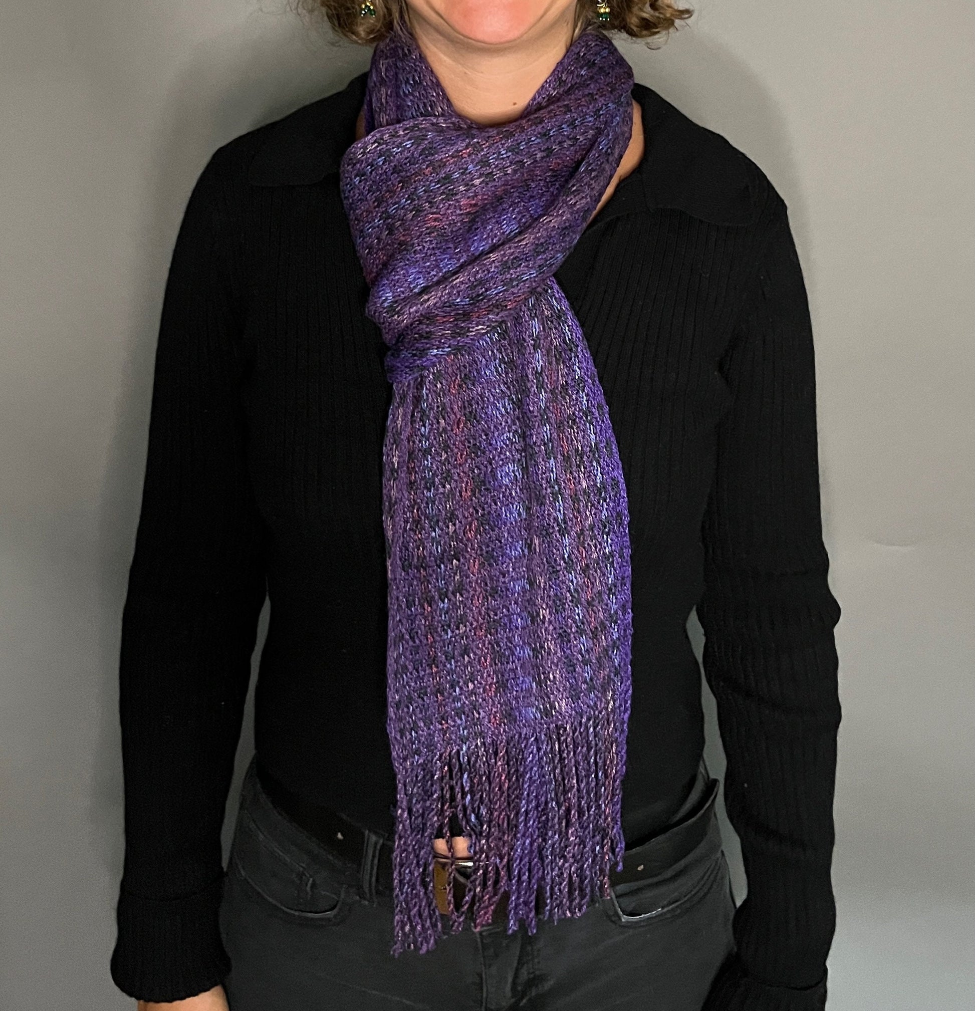 A handwoven silk and merino wool scarf made by the artist. This 8x73 inch scarf was made as a limited edition woven fiberart. The yarn is very fine (5000 yards/pound) making this wearable artwork warm, but thin enough to wear indoors and out! A hand washable (or dry-clean) textile artwork made to last. A great addition to any wardrobe, both functional and aesthetic.